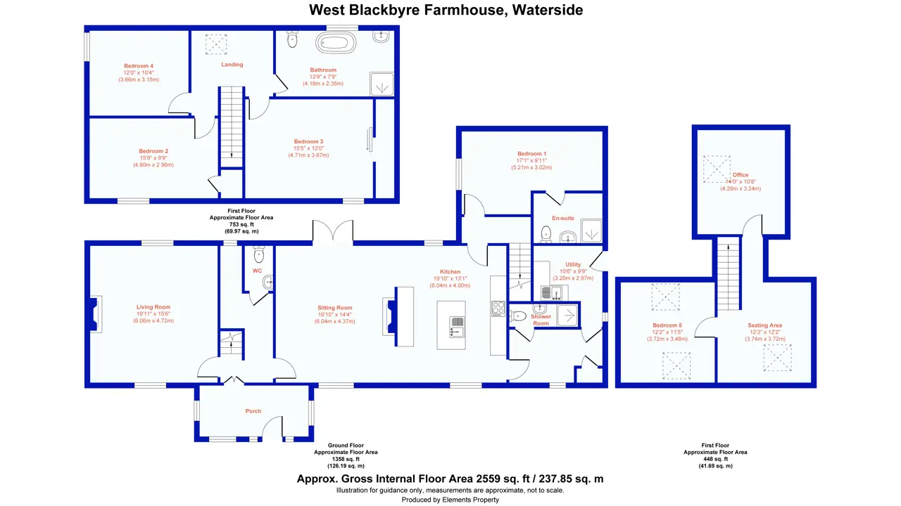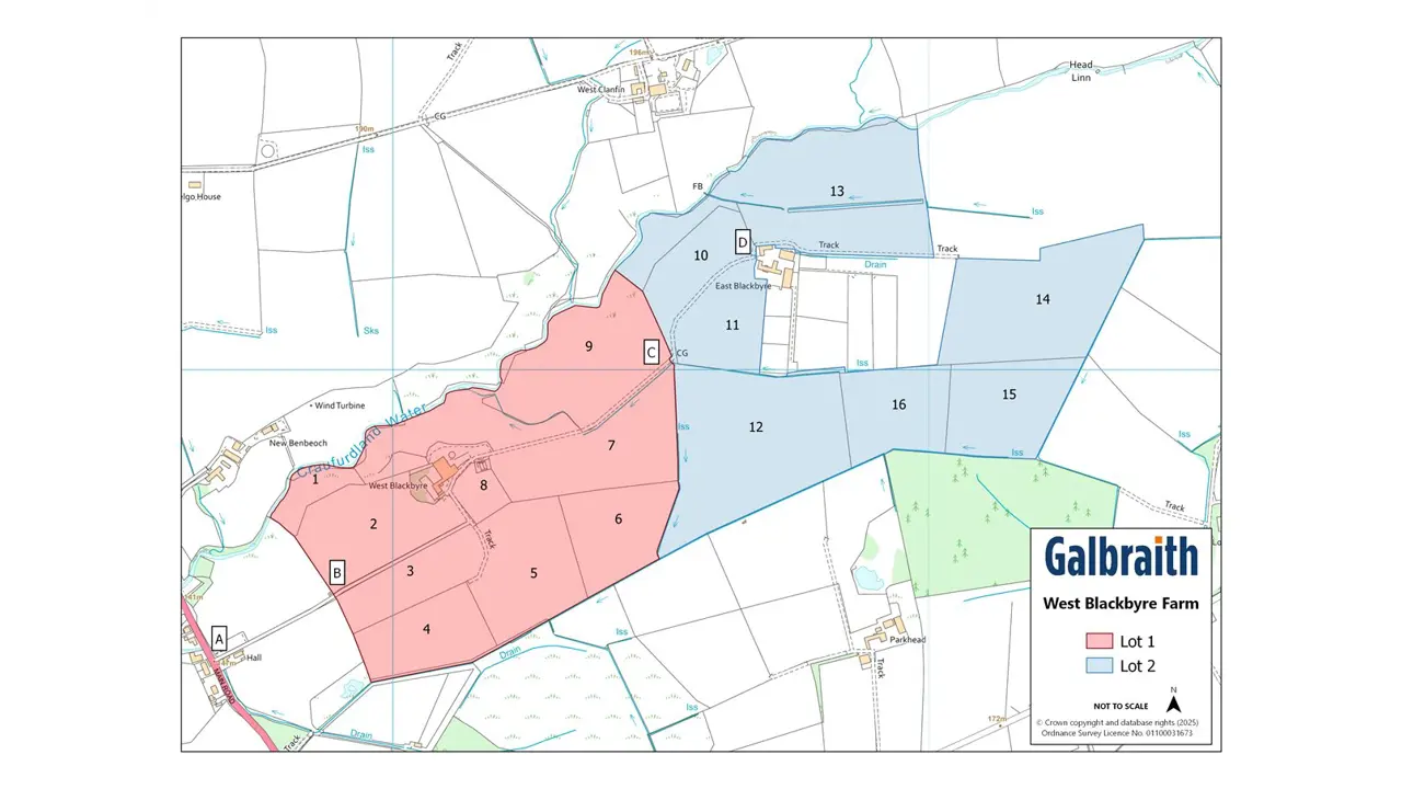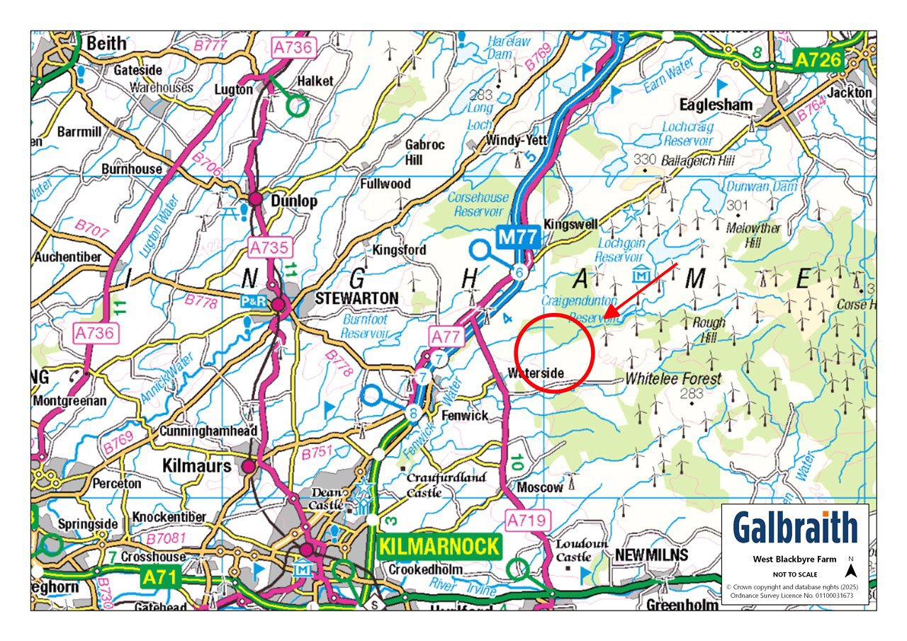 West Blackbyre is located close to the small rural village of Waterside, approximately 5 miles north of Galston. The village lies on the Craufurdland water which meanders through the north of the farm and historically provided employment to the area when it powered a local carding mill. An OS map of 1856 shows that whin stone and sandstone quarries were located downstream of the mill. Despite its rural location, Waterside is a popular base for commuters to Glasgow and offers access to the city centre via the M77. Nearby Galston offers a variety of local amenities including a doctor’s surgery, chemist, supermarket and both primary and secondary schooling. Private schooling is available at Belmont House, Hutchesons’ in Glasgow and Wellington in Ayr. A wider range of high street shops are available in Kilmarnock (6 miles) and Silverburn Shopping Centre, with over 100 shops, restaurants and cinema is just 13 miles away. The farm is situated in an area suited to dairy, beef and other mixed farming enterprises and is well served by the agricultural supply industry with Ayr Market 20 miles to the south.West Blackbyre presents an excellent opportunity to acquire a compact farming unit in rural East Ayrshire. The farm comprises a versatile livestock unit, equipped with a spacious attractive five bed farmhouse, a range of modern and traditional farm buildings and farmland which extends to approximately 68.22 Ha (168.58 Ac) in total including roads, yards and buildings. West Blackbyre has been in the seller’s ownership for a number of years and the current farming enterprise is centred around sheep with the land in a grassland rotation providing feed and forage for the farm business.METHOD OF SALEThe sale of West Blackbyre Farm offers purchasers an opportunity to acquire the farm either as a whole or in two lots:Lot 1: West Blackbyre Farmhouse, farm buildings and 30.95 Ha (76.48 Ac) of landLot 2: 35.65 Ha (88.09 Ac) of landPlease note that Lot 1 will not be sold prior to Lot 2.LOT 1West Blackbyre FarmhouseWest Blackbyre Farmhouse is of traditional stone construction with a harled and painted white finish set under a pitched slate roof. The substantial farmhouse comprises adaptable accommodation with the welcoming porch/sunroom giving access to the hall. The living room has a wood burning stove set in an attractive white surround and two arched wall alcoves. There is a superb open plan sitting room with wood burning stove opening to the dining kitchen with modern units, central island and AGA. From the kitchen there is a storage room, utility room and shower room. There is one ground floor bedroom with en suite shower room and completing the downstairs is a cloakroom/w.c. Stairs from the hall rise to three generously proportioned bedrooms and a stunning bathroom with claw-foot bath and separate shower cubicle. A second staircase off the kitchen gives access to one bedroom and an open seating area and office.Farm BuildingsSituated to either side of the farmhouse, the traditional range is constructed of harled stone under pitched corrugated and slate roofs with concrete floors comprising:• Former byre (13.62m x 4.85m)• Workshop (5.41m x 2.52m)• Store (5.61m x 10.58m)• Detached former garage/log storeModern RangeCattle Court (23.86m x 15.06m) - a four bay steel portal frame construction under a corrugated metal roof with brick walls and a combination of slats and concrete floor. Central feed passage and part self-locking yokes on feed barriers.Hayshed (24.63m x 6.92m) - a traditional six bay of steel portal frame construction, tin cladding set under a fibre cement roof with concrete floor.Lean-to Cattle Court (17.31m x 5.73m) of steel portal frame construction with corrugated roof, earth floor and metal feed barrier.Silage Clamp (27.5m x 5.89m) - brick and concrete panel walls with asphalt floor and effluent tank with capacity for 5,000 gallons.Redundant Slurry Store – ‘Howard Harvestore’ - Three ring store with capacity for 130,000 gallons.The LandThe land contained within Lot 1 extends to approximately 30.95 Ha (76.48 Ac) and is mostly of a ploughable nature but is currently down to grass and is used for sheep grazing and fodder production. The land is contained within one block, split across 9 field parcels, with an area of glen along the Craufurdland water. The land has been classified as predominantly Grade 4 with sections of Grade 5(1) and Grade 5(3) by the James Hutton Institute. The fields are well laid out and of a generous size, easily accommodating modern machinery, and benefit from access either internal tracks or directly from the farm steading. The land rises from 148m above sea level at its lowest point to 172m at its highest point.LOT 2The land at Lot 2 extends to approximately 35.65 Ha (88.09 Ac). The land is contained within one block, split into 7 field parcels and is situated to the east of Lot 1. The land has been classified as predominantly Grade 4 with sections of Grade 5(1) and Grade 5(3) by the James Hutton Institute. The farmland predominantly is ploughable but is currently down to grass and used for sheep grazing and fodder production. There is an area of glen along the Craufurdland water and the land rises from 168m above sea level at its lowest point to 202m at its highest point.NITRATE VULNERABLE ZONE (NVZ)West Blackbyre Farm is not included within a Nitrate Vulnerable Zone.IACS / BASIC PAYMENT SCHEME (BPS) 2025All the farmland is registered for IACS purposes. Any payments relating to the 2025 scheme year will be retained by the Seller. If applicable, the Purchaser(s) will be responsible upon occupation of the subjects of sale to comply fully with the Statutory Management requirements to maintain the farmland in Good Agricultural and Environmental Condition (GAEC) as laid down under the Cross Compliance rules of the Basic Payment Scheme (BPS) for the remainder of the scheme year. The Seller may enter discussions with the Purchaser to transfer the right 