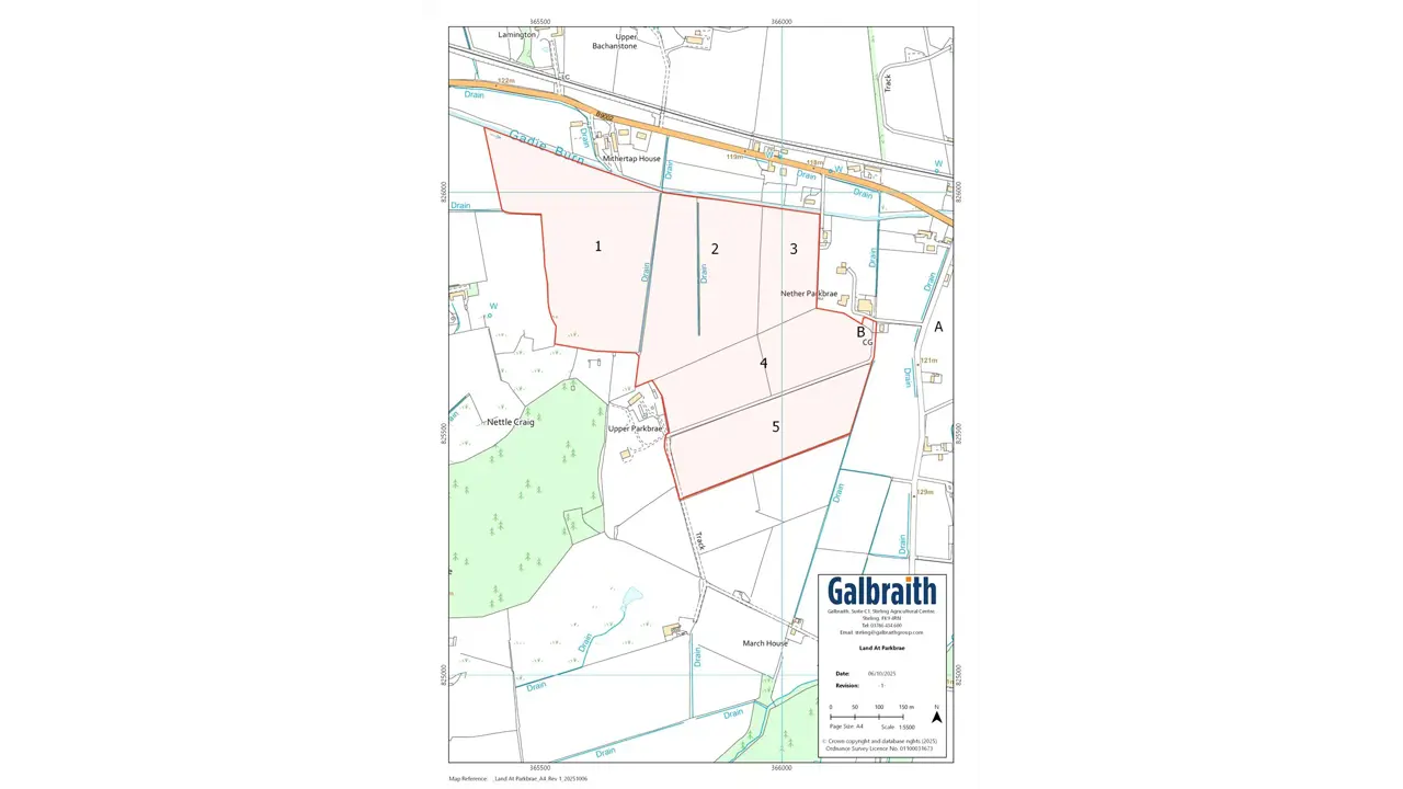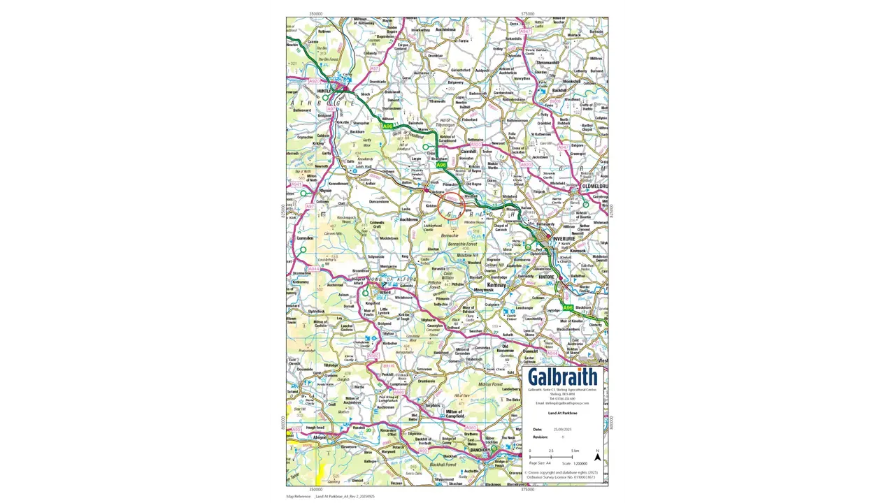 The land at Parkbrae consists of a partially fenced block of agricultural land of approximately 77.07 acres (31.19 hectares) suitable for a wide variety of agricultural uses. According to the James Hutton Institute the land is classified as grade 3(1) and 3(2) and is therefore capable of achieving high yields and growing a wide range of crops. The land is made up of five field parcels rising from approximately 120m to 150m above sea level. The land is in good heart having historically been part of a mixed farming enterprise, benefitting from regular applications of muck and the inclusion of break crops and temporary grass leys into the rotation. The land is partially fenced for the containment of sheep and cattle and benefits from a private water supply.Land at Parkbrae extends to approximately 77.07 acres (31.19 hectares) and benefits from access to the public road network via the access track shown as A/B on the sales plan. The land is conveniently situated 2 miles south east of Insch, 7 miles north west of Inverurie and 20 miles from Aberdeen. The land is encompassed by similar agricultural holdings and woodlands. The area is well resourced to service beef, sheep and arable enterprises.