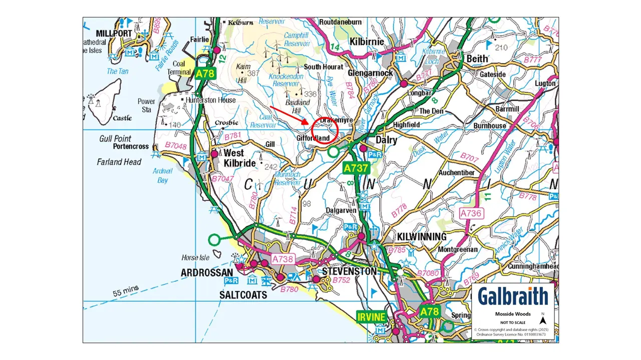 Mosside Wood is situated about 1 mile north west of Dalry, North Ayrshire and about 28 miles south west of Glasgow.Mosside Wood is a productive woodland extending to about 20.75 Ha (51.27 acres). The woodland was established in 2005. The plantation comprises Sitka Spruce, Larch, mixed broadleaves and open ground. The woodland is well stocked, comprising of Sitka Spruce from seed based improved stock, specifically chosen for stem straightness, superior volume/diameter per tree and an increase in wood density. The plantation can be accessed off the Fairlie Moor Road, Dalry and the woodland is on the west of this public road.According to the Macaulay Land Use Research Institute, the underlying land at Mosside falls within Category 4.2 in terms of agricultural production. The land sits between 81.8 metres and 98.0 metres above sea level.Further details are available from the selling agents.Mosside Wood is offered for sale as a whole.HISTORIC SCOTLANDNo parts of the property are subject to any historical or scheduled monuments.ACCESSConditional Planning Permission has been granted to provide gated vehicular access into the woodland from the public road.DIRECTIONSFrom Glasgow, take the M8 towards Glasgow Airport, at Junction 28a take the A737 towards Irvine. Continue through Beith and on to Dalry. At Hillend roundabout, turn right onto Kilwinning Road and turn left onto Vennel Street, then turn left joining the B780 (Kilbirnie/West Kilbride/Adrossan). After the cemetery turn right onto Wingfaulds Avenue, proceed along this road onto the Fairlie Moor Road for about 0.59 miles and Mosside woodland is then on the left.KA24 5HPWHAT3WORDSTo find this property location to within 3 metres, download and use What3Words and enter the following 3 words: duty.packets.disbelief